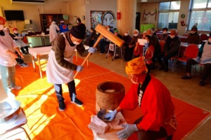 この日、午前中は餅つき大会です。応援・見学の方が見守る中、入居の方にも餅をついたり、丸めたり頑張っていただきました♪