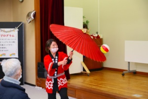 職員渾身の傘回し~!紙風船から傘に糸がつながってるって?…気のせいです!